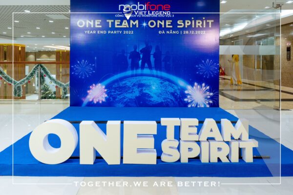 Photo booth with the main blue color bearing the MobiFone imprint. The satellite surrounding the Earth represents the increasingly widespread and growing MobiFone network. Embossing letters in front of the photo booth highlights the theme One Team – One Spirit.