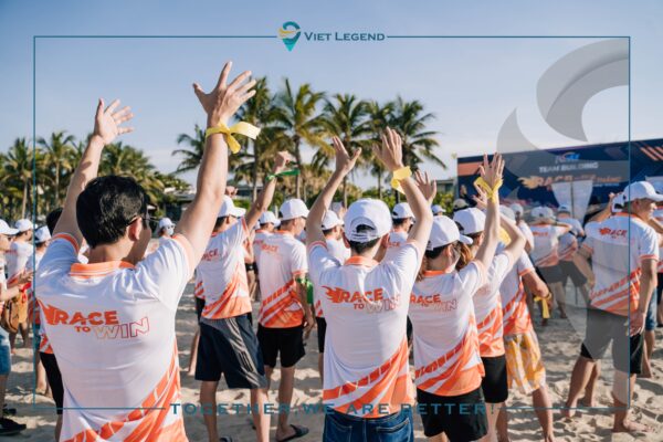 Race to Win Team Building starts by a vibrant dance in order to boost the athletes’ morale before the official race. Orange and white costumes highlight the graceful movements of the dancers.