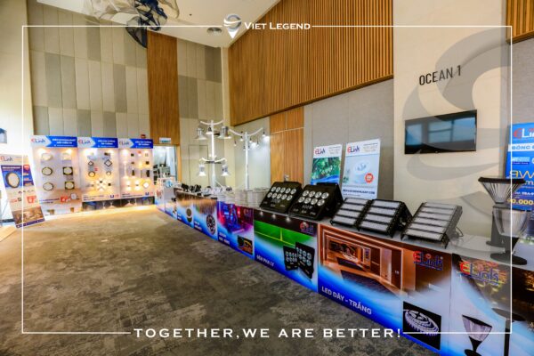 Vùng chữ nổi chủ đề chương trình Hội nghị khách hàng New Light – New Life kết hợp ánh sáng đầy nổi bật ở khu vực photobooth. Logo thương hiệu được lồng ghép trong hình ảnh của bóng đèn đại diện sứ mệnh mang nguồn ánh sáng mới của Elink đến người tiêu dùng Việt. Phía trước photo booth là những khối sáng đủ dáng hình thú vị từ vuông vức đến tròn trịa.