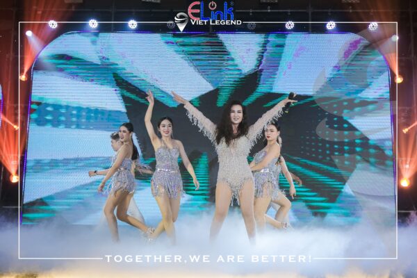 Sân khấu là nơi chiêu đãi bữa tiệc ánh sáng đầy mãn nhãn. Màn hình Led chính shape chữ nhật bo tròn hai góc tạo cảm giác như cánh cửa rộng lớn bước vào kỷ nguyên ánh sáng. Bốn Led cánh bổ trợ hai bên tựa những tấm gương phản chiếu tia sáng rực rỡ. Nổi bật trên những thiết bị hiện đại là hình ảnh key visual lấy cảm hứng từ hành tinh ánh sáng nơi quả cầu Elink được nuôi dưỡng với sứ mệnh phân phát ánh sáng đến nhân loại.